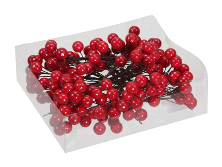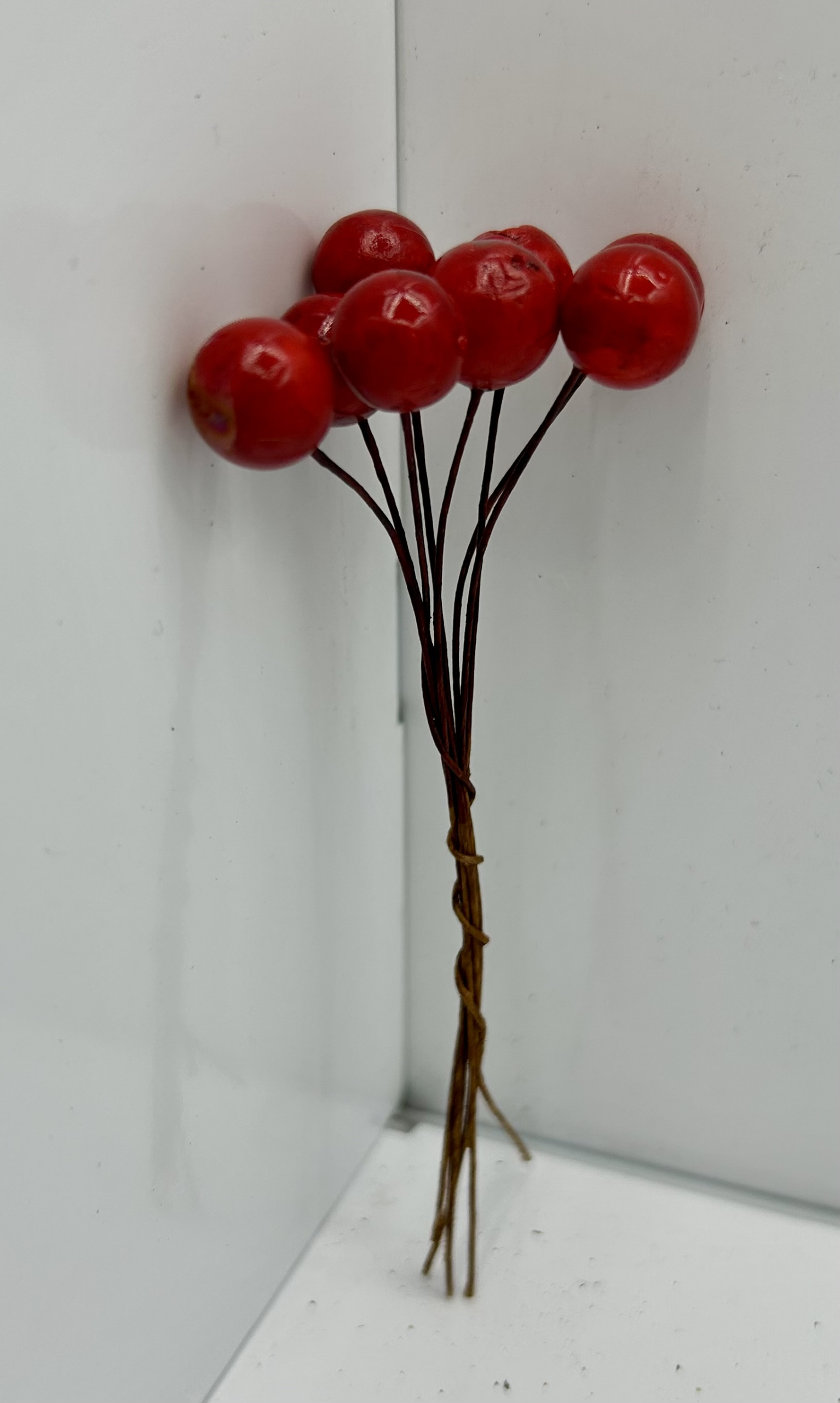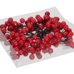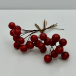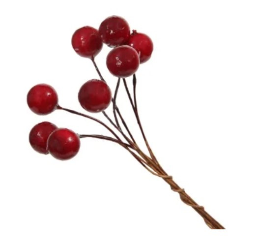 Dekorative kunstige Ilex bær, monteret på brun ståltråd, så de nemt kan placeres i dekorationer. Perfekte til juledekorationer, nissedøre, kranse, blomsterarrangementer og kreative hobbyprojekter.