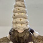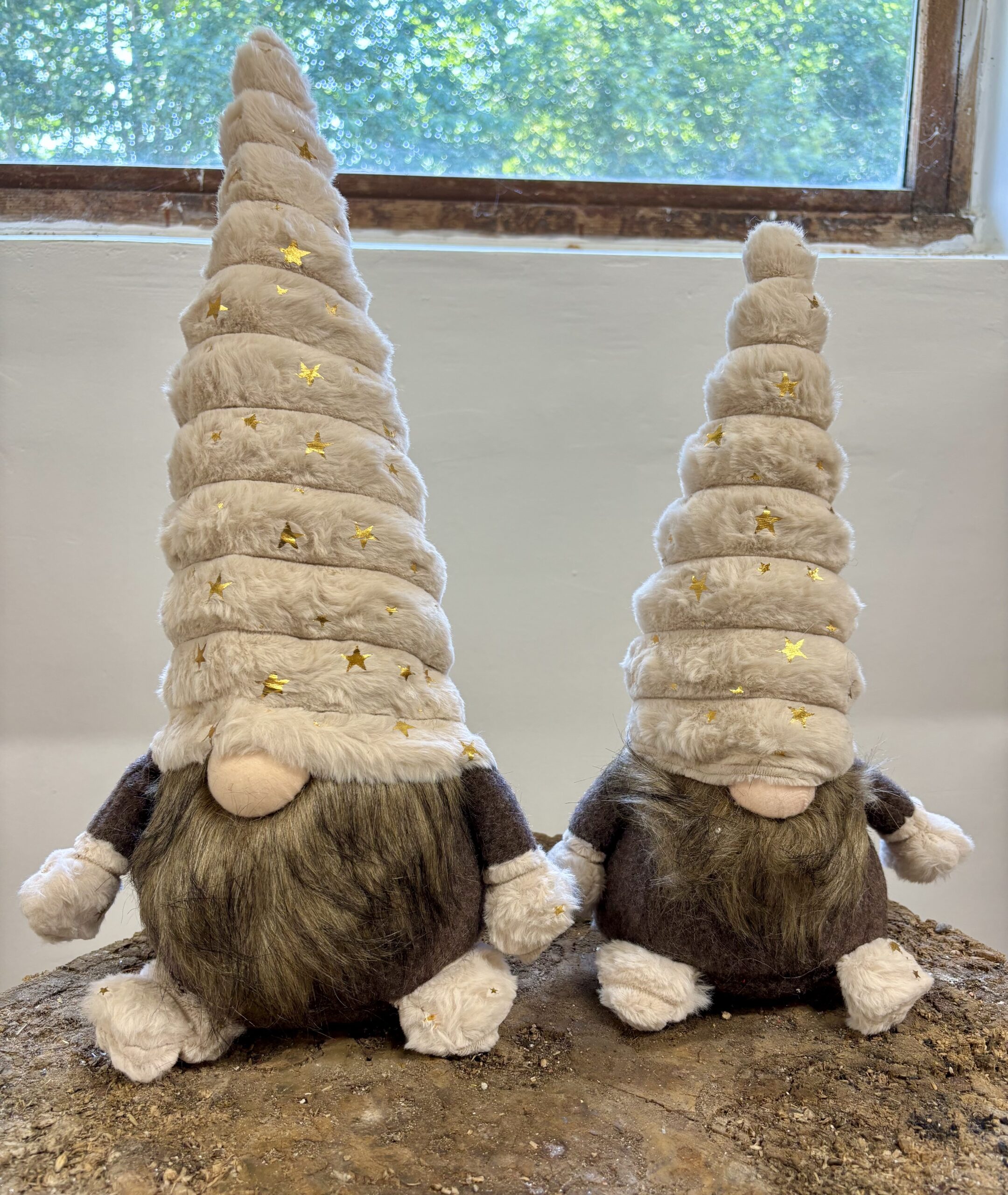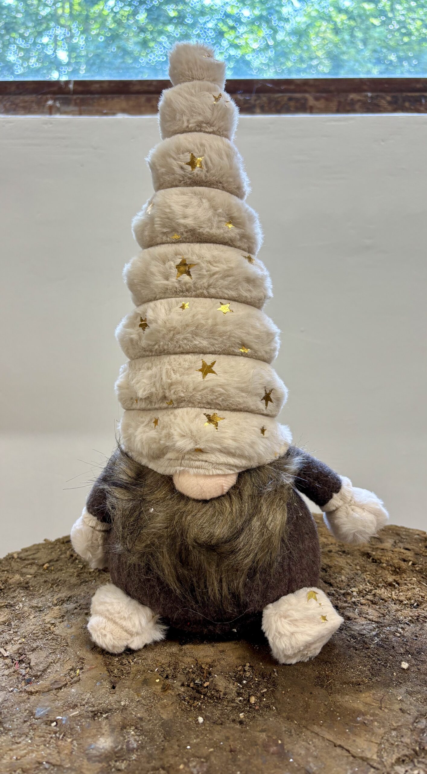Denne charmerende og bløde nisse spreder julehygge i ethvert hjem. Nissen har en stor, blød, beige hue med fine guldstjerner og et langt, fyldigt skæg. Den hyggelige næse titter lige frem under huen.